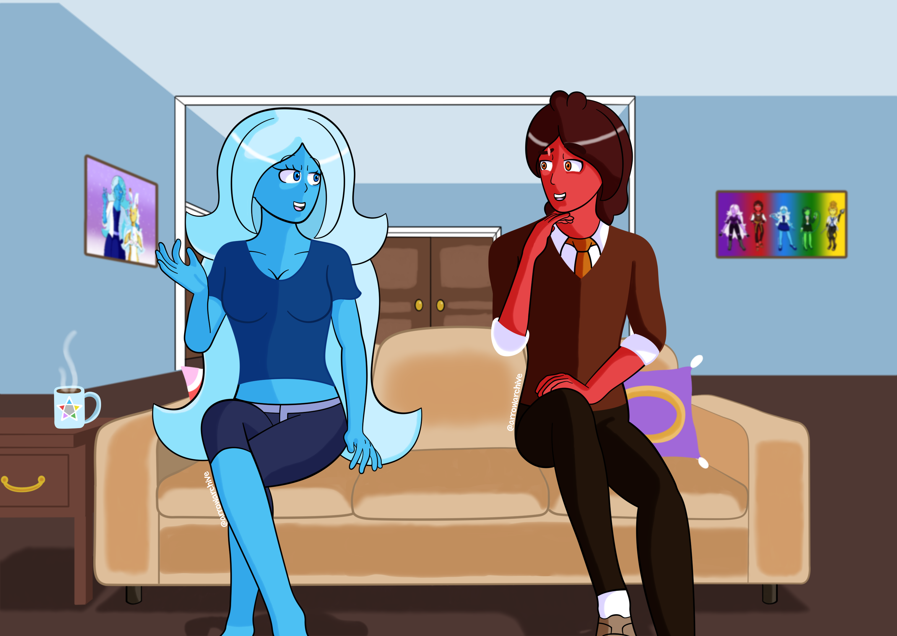 The room is plain for what it is and the characters are wearing casual clothes, but that is what the piece is supposed to be: casual. I didn't want to fret over the folds on Aqua's dress or how the emblem on Pyro's shirt would look post-shading. I feel like this may be redrawn once I have more experience, but I like how it looks.
